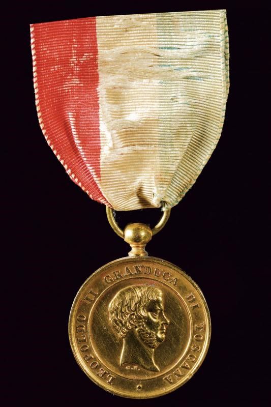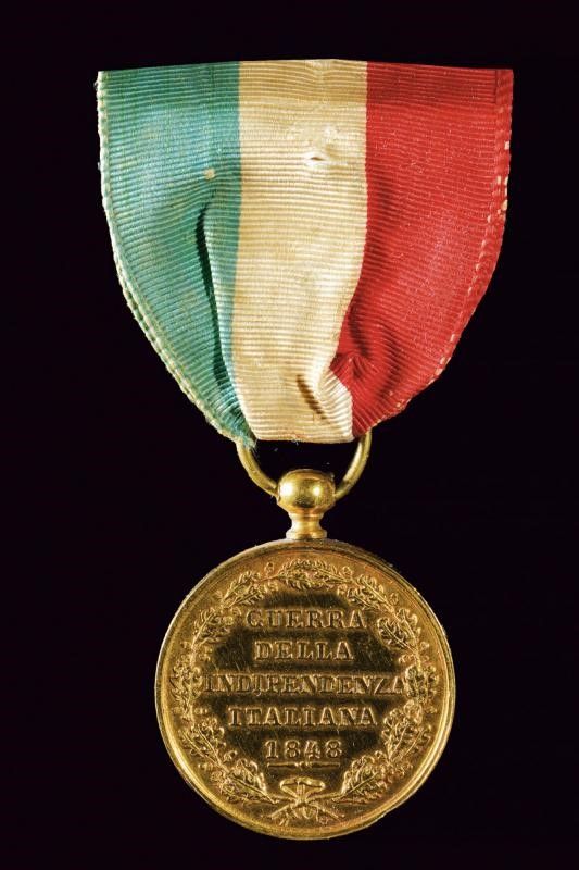 Granducato di Toscana, diametro 3.8 cm. 1848 Medaglia per i reduci dalla Guerra d'Indipendenza. In bronzo dorato. Al dritto testa a destra ed iscrizione 'LEOPOLDO II GRANDUCA DI TOSCANA'. Al rovescio 'GUERRA DELLA INDIPENDENZA ITALIANA 1848'. Con nastro originale.