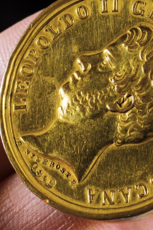 Granducato di Toscana, diametro 3.4 cm. 1849 Rara medaglia al merito concessa alle persone che cooperarono per il ristabilimento del regno dopo la fuga di Leopoldo a Gaeta. In bronzo dorato. Al dritto busto verso sinistra e attorno l'iscrizione 'LEOPOLDO II GRANDUCA DI TOSCANA'; sotto al taglio del
