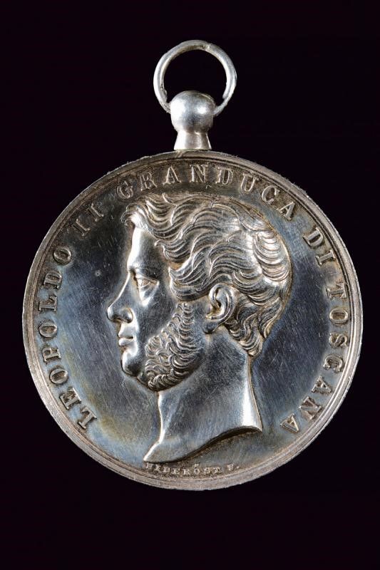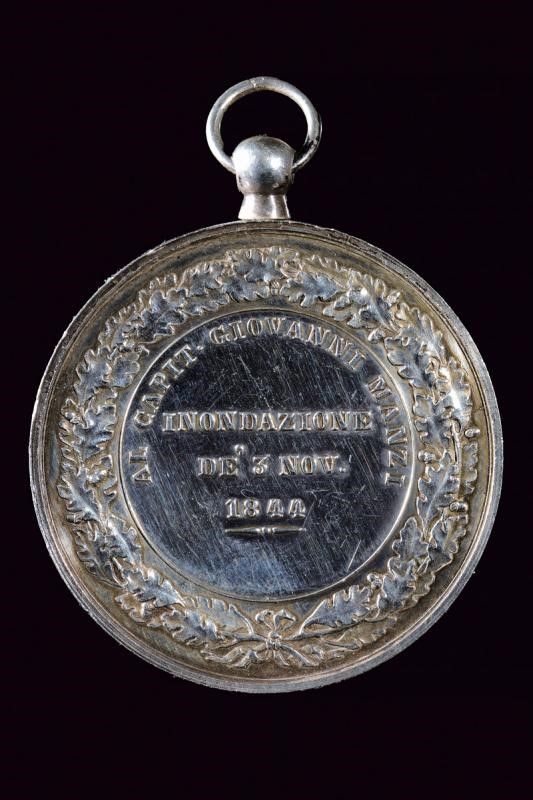 Granducato di Toscana, diametro 4.1 cm. 1844 Medaglia assegnata al capitano Giovanni Manzi; in argento. Al dritto busto verso sinistra, al bordo 'LEOPOLDO II GRANDUCA DI TOSCANA'; opus 'NIDERÖST F.' Al rovescio, entro corona di quercia, 'AL CAPIT. GIOVANNI MANZI INONDAZIONE DE' 3 NOV. 1844'. Al somm