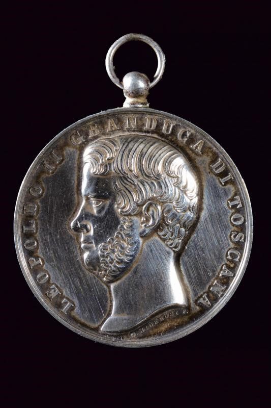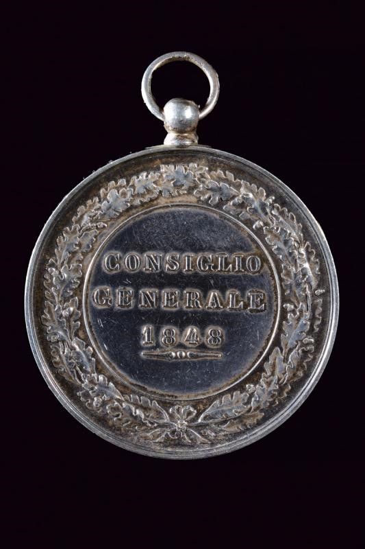 Granducato di Toscana, diametro 4.1 cm. 1848 Rara medaglia assegnata ai rappresentanti del consiglio generale, in carica dal gennaio 1849 al 21 settembre 1850. In argento. Al dritto busto verso sinistra con attorno iscrizione 'LEOPOLDO II GRANDUCA DI TOSCANA'; opus 'G. NIDERÖST F.'. Al rovescio, ent