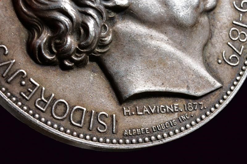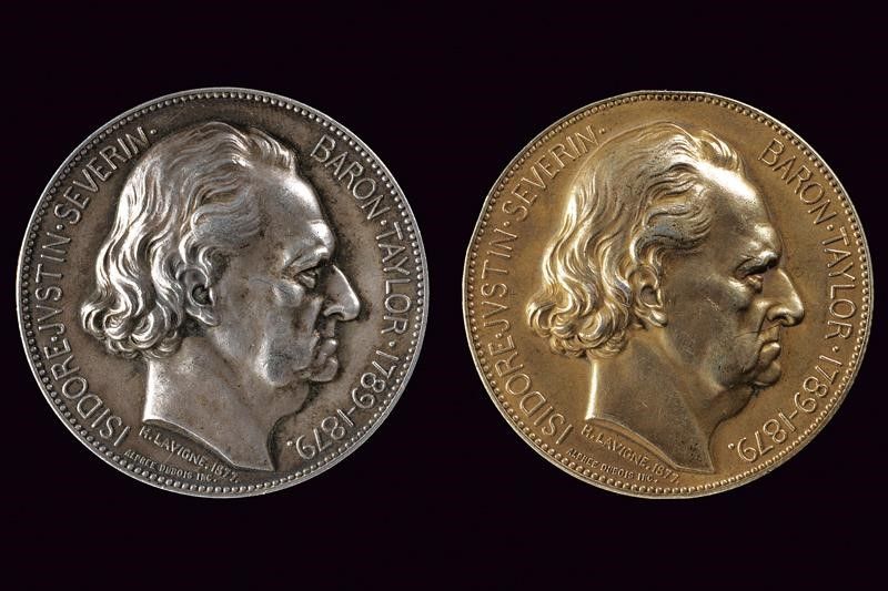 Francia, diametro 5 - 5 cm. Fine XIX inizio XX Secolo Entrambe recanti al dritto rappresentazione in rilievo del barone Taylor ed iscrizioni 'ISIDORE JVSTIN SEVERIN' e 'BARON TAYLOR 1789 - 1879'; opus 'H. LAVIGNE. 1877. / ALPHEE DUBOIS INC.'; sul bordo punzone e marcatura 'ARGENT'. Quattro settori definiscon