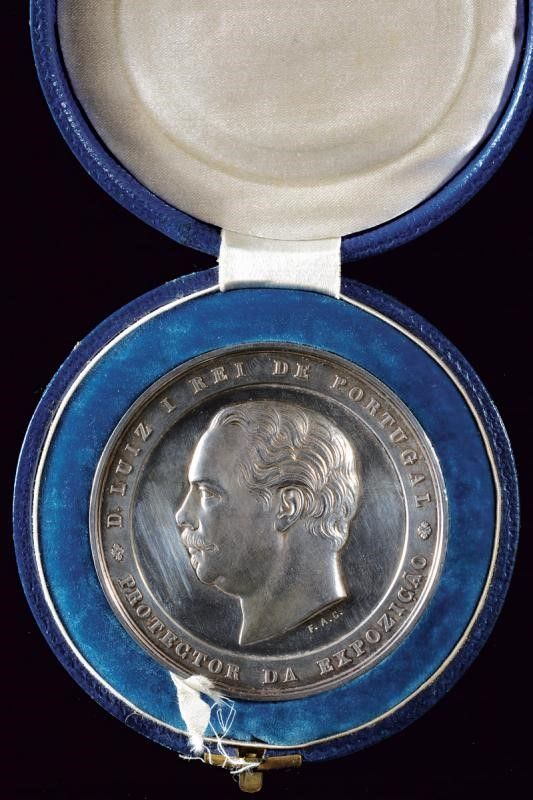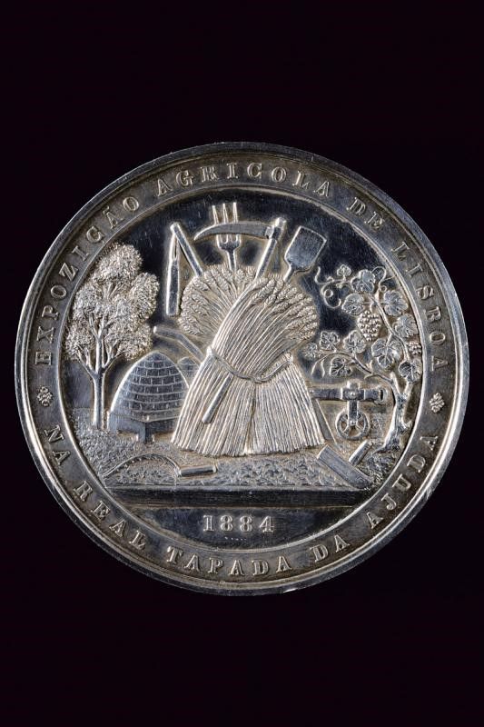 Portogallo, diametro 5.9 cm. 1884 Medaglia per esposizione agricola, in argento. Al dritto busto verso sinistra, attorniato da: 'D. LUIZ I REI DE PORTUGAL / PROTECTOR DA EXPOZICAO'; sul taglio del collo 'F.A.C.' Al rovescio, bella raffigurazione con strumenti agricoli, sul bordo 'EXPOZICA