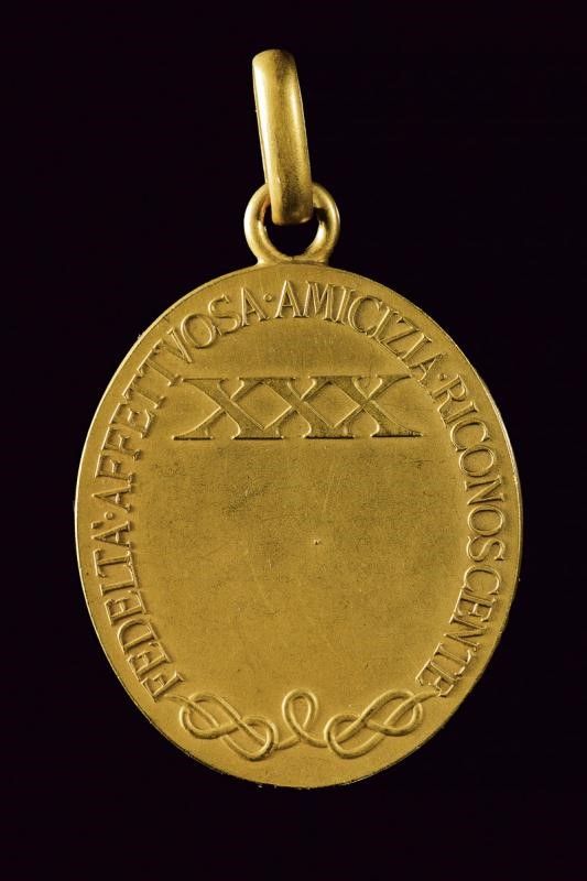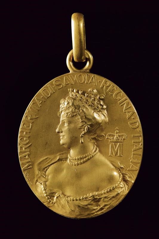 Regno d'Italia, dimensioni 3.8 x 5.2 cm. ultimo quarto del XIX Sec. Medaglia ellittica in bronzo dorato. Al dritto busto a sinistra, con iscrizione 'MARGHERITA DI SAVOIA REGINA D'ITALIA'; opus 'M CROCE'. Al rovescio 'FEDELTA' AFFETVOSA AMICIZIA RICONOSCENTE XXX'. In astuccio in pelle verde, recante sul coperchio bello scu