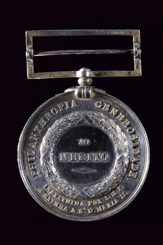 Portogallo, diametro 4 cm. Medaglia al merito, in argento. Al dritto busto verso sinistra con attorno: 'D. MARIA II RAINHA DE PORTUGAL', sul taglio del collo 'GERARD F.' Al rovescio 'PHILANTHROPIA GENEROSIDADE. / AO MERITO / INSTITUIDA POR S.M.F. A RAINHA A S.A D. MARIA II.'