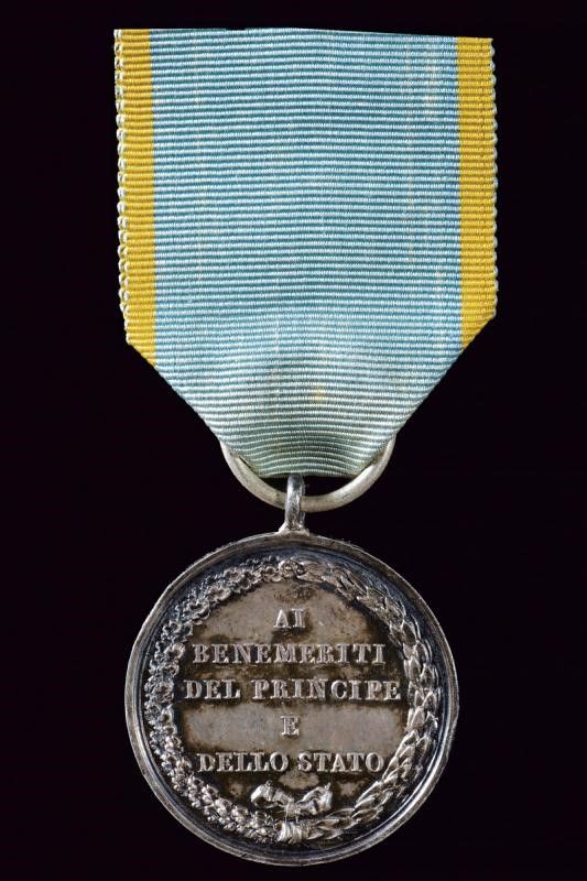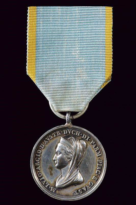 Ducato di Parma e Piacenza, diametro 2.3 cm. 1836 Rara medaglia ai benemerenti del principe e dello stato; in argento. Al dritto busto verso sinistra, con iscrizione 'M. LVIG. ARCID. D'AUVSTR. DVCH. DI PARM. PIAC. E GVAST.' Al rovescio entro rami di quercia ed alloro la legenda 'AI BENEMERITI DEL PRINCIP