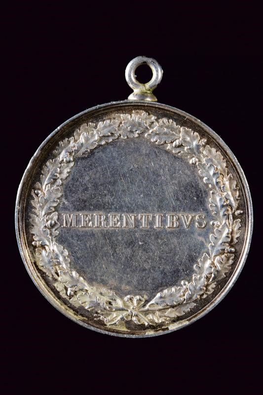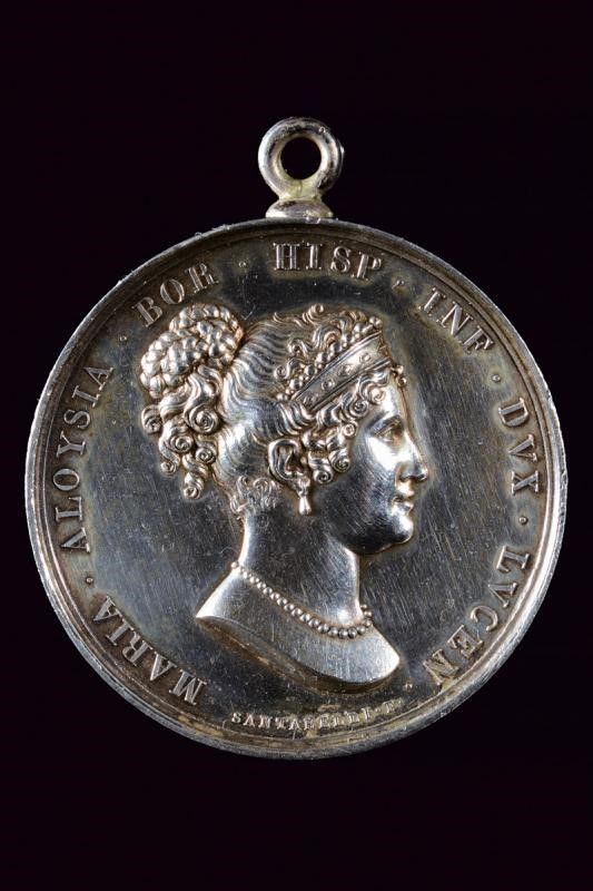 Ducato di Lucca, diametro 4.1 cm. 1816 Rara medaglia di premio per i benemeriti del ducato, in argento. Al dritto busto verso destra, al bordo 'MARIA ALOYSIA BOR HISO INF DVX LVCEN'; opus 'SANTARELLI F.' Al rovescio entro corona di quercia la parola 'MERENTIBVS'. Al sommo anello di sospensione