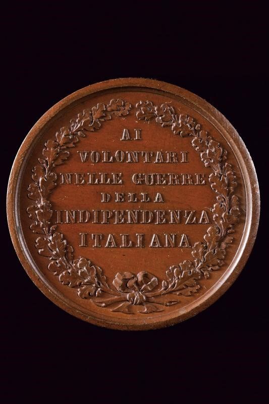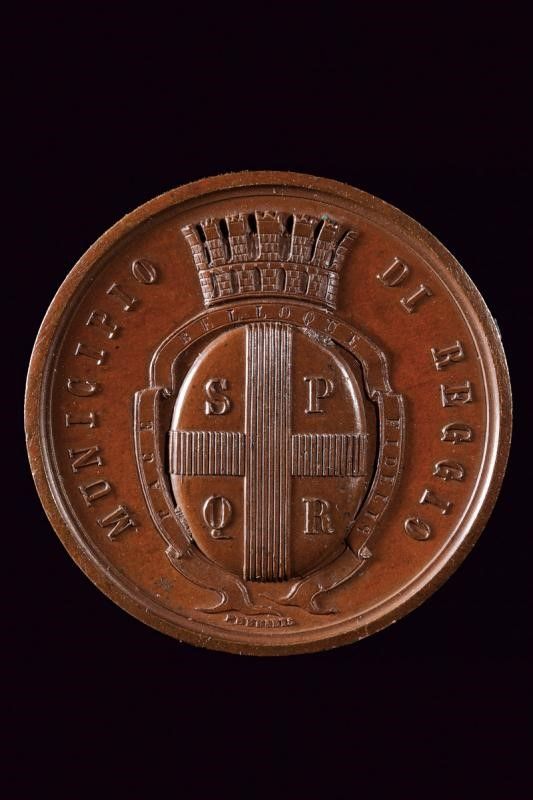 Reggio Emilia, diametro 2.9 cm. 1859 In bronzo; del Municipio ai volontari nelle guerre d'Indipendenza. Al dritto stemma di Reggio con iscrizione 'MUNICIPIO DI REGGIO' con stemma. Opus 'FERRARIS'. Al rovescio 'AI VOLONTARI NELLE GUERRE INDIPENDENZA ITALIANA'.