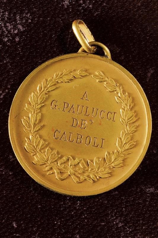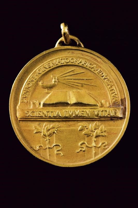 Regno d'Italia, diametro 3.2 cm. Secondo quarto del XX Secolo Su una faccia 'L'VNIONE CINEMATOGRAFICA EDVCATIVA / SCIENTIA LVMEN VITAE'; sull'altra 'A G. PAULUCCI DE' CALBOLI' entro fronde di lauro. Al sommo un anello di sospensione. Oro. 16g. In astuccio rivestito in pelle e foderato interamente in raso.