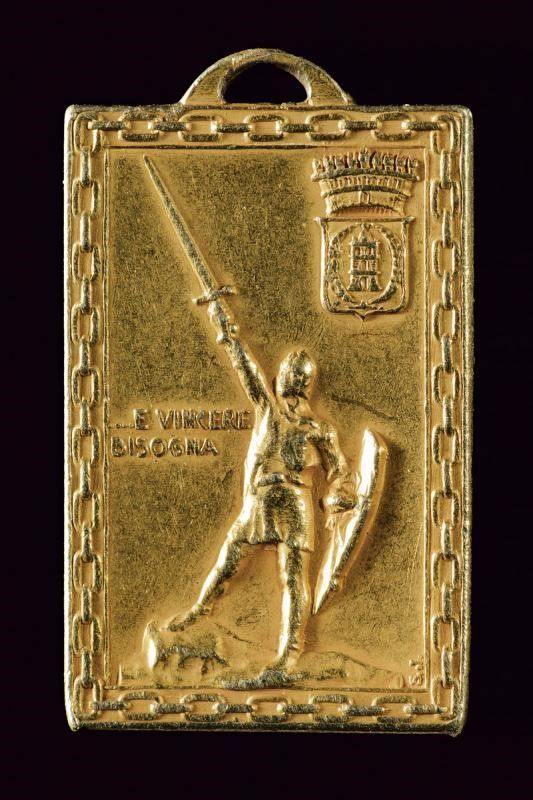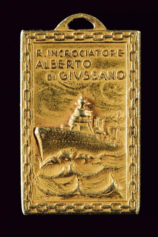 Regno d'Italia, dimensioni 1.9 x 2.9 cm. Prima metà del XX Secolo Di forma rettangolare. Al dritto 'R. INCROCIATORE ALBERTO DI GIVSSANO' con effige della nave. La cornice a catena. In basso a sinistra 'K 18'. Al rovescio cavaliere con spada tratta, con stemma e motto '...E VINCERE BISOGNA'. Opus 'S.J. ' 8.7 g.
