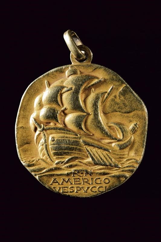 Regno d'Italia, diametro 2.7 cm. XIX/XX secolo Al dritto immagine di un veliero in bassorilievo ed iscrizione 'R. N. AMERIGO VESPVCCI'. Al rovescio testa di uomo barbuto su timone ed iscrizione 'PER LA PATRIA E PER IL RE'. Opus 'S. J.' e firma 'Era' (?). Molto rara. 14.5 g.