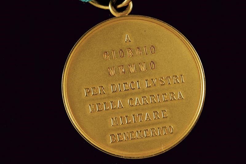 Repubblica Italiana, diametro 5.05 cm. Seconda metà del XX Secolo In oro. Al recto San Maurizio a cavallo con iscrizione 'S. MAURIZIO PROTETTORE DELLE NOSTRE ARMI'. Opus: Ferraris. Sul retro: 'A GIORGIO MEMMO PER DIECI LVSTRI NELLA CARRIERA MILITARE BENEMERITO'. Punzone sul taglio '917'. Con nastro verde. Oro 917/1000.