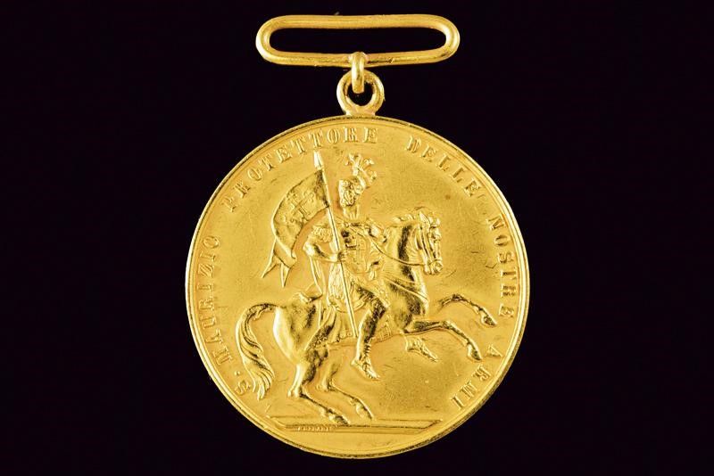 Repubblica Italiana, diametro 3.59 cm. Seconda metà del XX Secolo In oro. Al recto San Maurizio a cavallo, con iscrizione 'S. MAURIZIO PROTETTORE DELLE NOSTRE ARMI'. Opus: Ferraris. Sul retro: 'A GIACOMO REIELLI PER DIECI LVSTRI NELLA CARRIERA MILITARE BENEMERITO'. Punzone 'Z 917'. Oro 917/1000. 35 g. Rara.