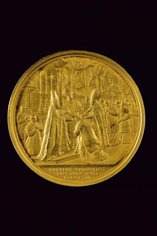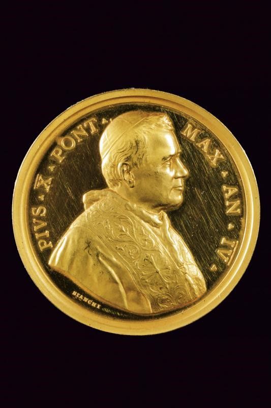 1907 In oro. Al dritto busto verso destra, con attorno l'iscrizione 'PIUS X PONT MAX AN IV'; opus 'BIANCHI'. Al rovescio scena di consacrazione dei nuovi vescovi. Peso 55 g.