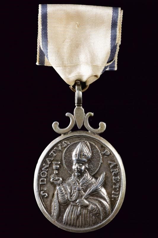 Arezzo, dimensioni 4.1 x 6.8 cm. 1796 In argento. Al dritto 'S. DONATVS P. ARETI' e raffigurazione di un busto a tre quarti del vescovo col capo cinto da mitra, e reggente il calice e un ramo di palma. Al rovescio 'VEN. IN CATHE ARET', busto della B. V. di fronte entro riquadro; in esergo '17