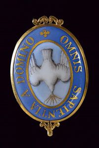Stato Pontificio, dimensioni 2.2 x 3.8 cm. 1840 circa Di piccolo formato, in oro con smalti. Sormontato da trofeo [..]