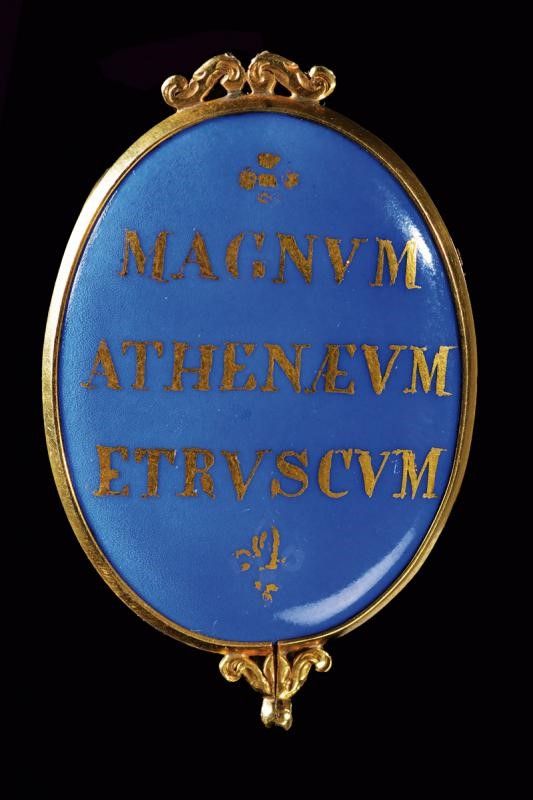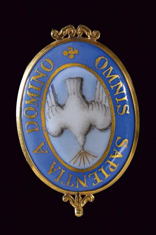 Francia, dimensioni 2.4 x 3.8 cm. Fine del XIX Secolo Medaglione ellittico in oro e smalti. La faccia anteriore con effige dello Spirito Santo e iscrizione 'OMINIS SAPIENTIA A DOMINO'. Sul retro smalto blu e iscrizione dorata 'MAGNVM ATHENÆVM ETRVSCVM'. Manca l'anello di sospensione.