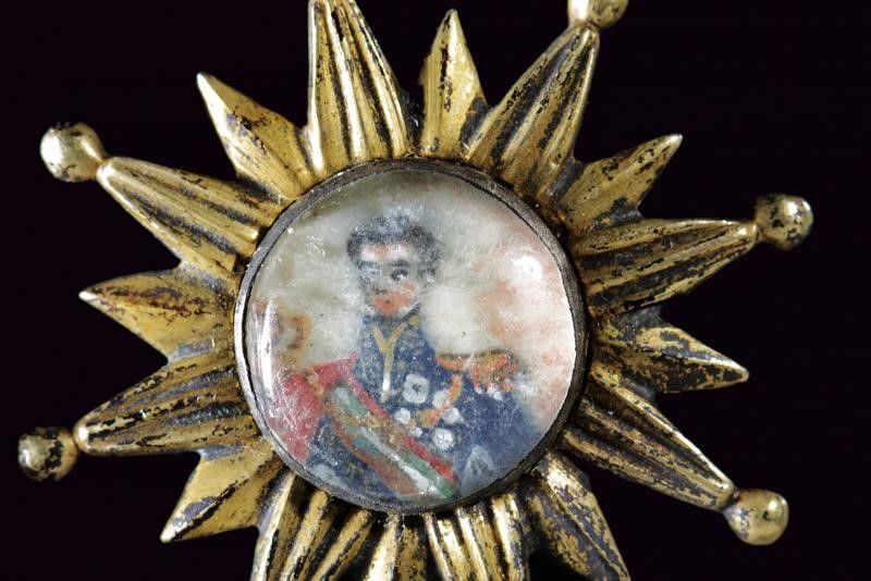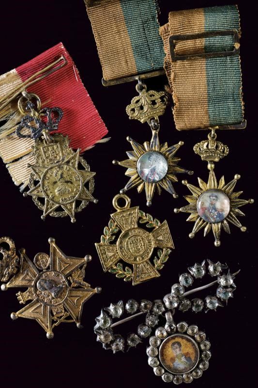Portogallo, dimensioni various cm. Secondo quarto del XIX Secolo Due stelle in bronzo dorato con medaglione recante il busto dipinto di Michele del Portogallo, tre distintivi differenti e una spilla che mostra il busto del re con cornice e fiocco in simil-diamanti. Alcuni fregi con nastro.