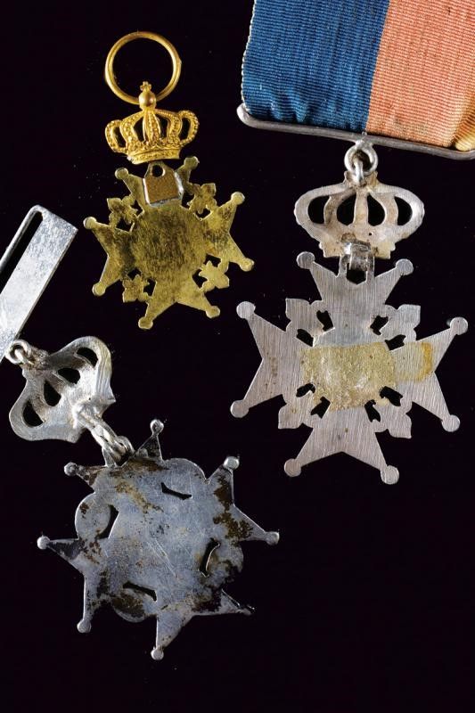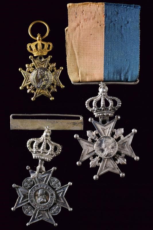 1828 Lotto di tre distintivi. Una croce con data 1828 per l'incoronazione, e due marcate 'MIGUEL PRIMEIRO'. Tutte con corona, una con nastro.