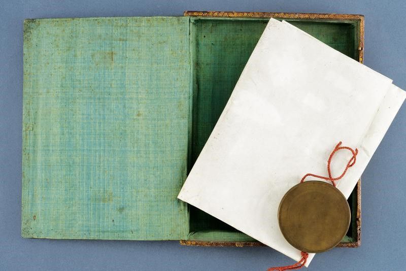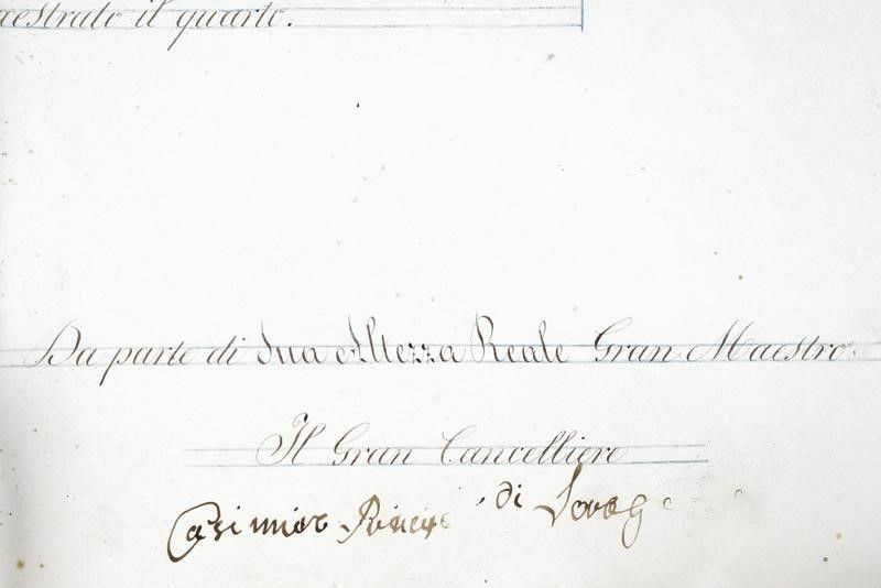 Ducato di Parma e Piacenza, diametro box 27 x 21.5 cm. 1852 Interessante diploma in pergamena per il conferimento dell'ordine con titolo di cavaliere di prima classe al nobile Fabio Gabrielli. Il documento si apre con 'NOI CARLO III DI BORBONE / Infante di Spagna / PER LA GRAZIA DI DIO / DUCA DI PARMA E PIACENZA E