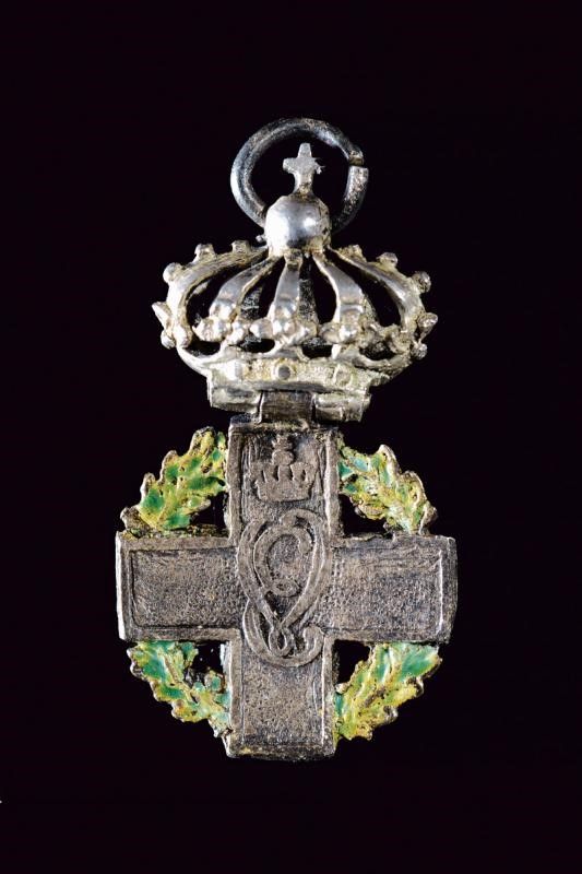 1815 - 1855 Croce in argento smaltata in rosso e bianco, incisa sul retro con il monogramma regio 'VE'. Sormontata da corona. Piccole crepe nello smalto bianco.