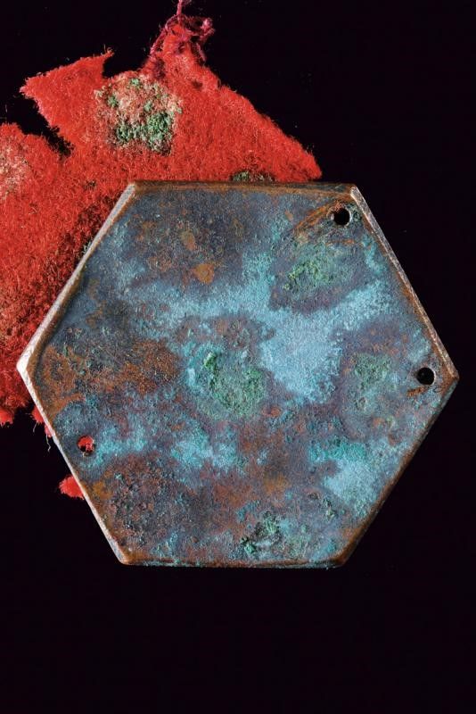 Stato Pontificio, diametro 3.8 x 3.4 cm. 1822 Distintivo per i volontari delle truppe pontifice, grado 'volontario'; in bronzo. Di forma esagonale con impressi trofei militari con l'epigrafe 'VOLONTARIO'. Tre fori. Il retro liscio, con ossidazioni; ancora presente, ma staccato, il pezzo di tessuto ro