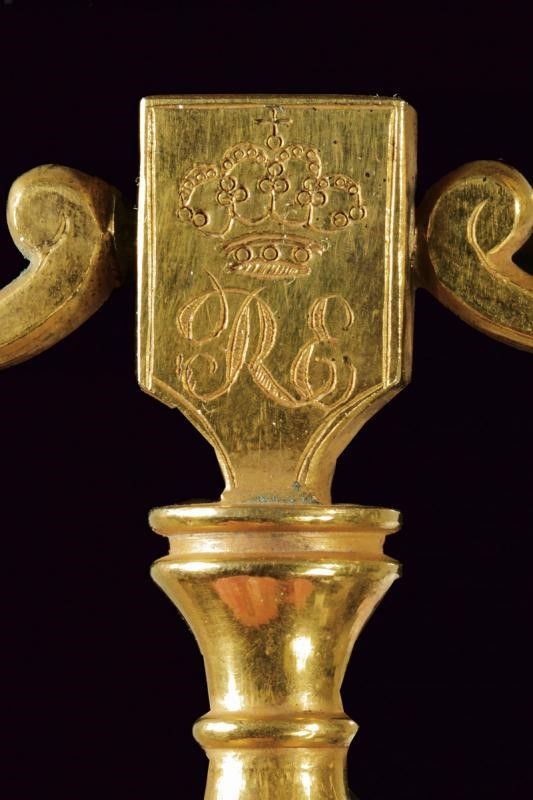Regno d'Etruria, altezza 15.3 cm. 1801 - 1803 In bronzo dorato; recante al culmine del gambo il monogramma regio 'L1' (per Ludovico Primo) su una faccia e 'RE' (per Regno d'Etruria) sull'altra, entrambi i fregi sormontati da corona. La chiave è accompagnata da un vecchio cartellino con iscrizione ver