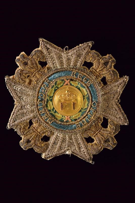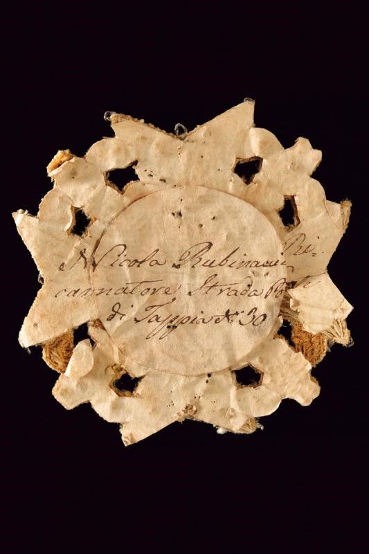 Regno delle Due Sicilie, dimensioni 7.8 x 7.8 cm. 1829 - 1860 Placca di gran croce realizzata in pailette, canutiglia e ricami; all centro medaglione in oro con monogramma 'FI'. La parte posteriore ricoperta di carta con iscrizione vergata a mano 'Nicola Rubina.. Ricannatore Strada Ponte di Tappia N. 30'. Raro esemp