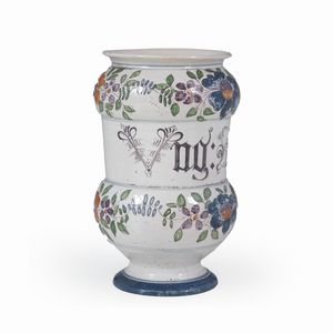 Maiolica. Marca: assente. Altezza cm 41,7. Conservazione: alla sommità rotta sotto la testa del cherubino; [..]