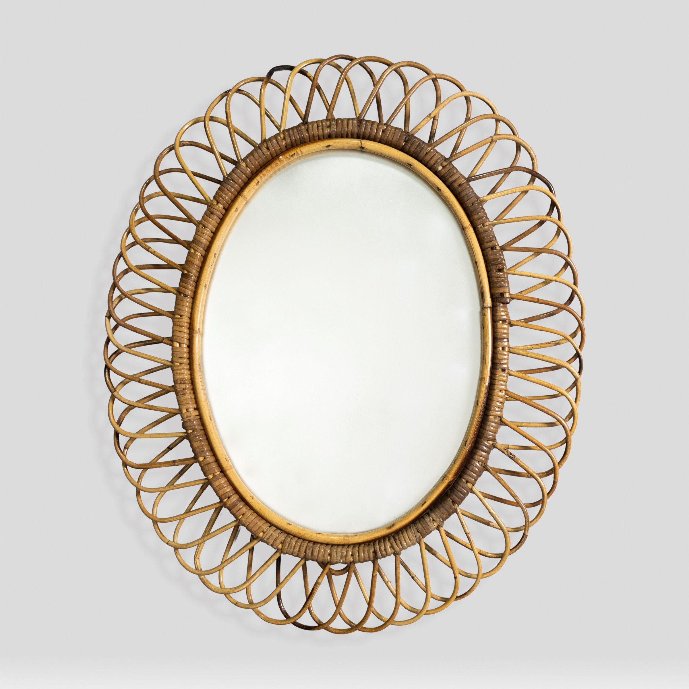 anni 60 specchio da parete in vetro specchiato, rattan, midollino e bambù