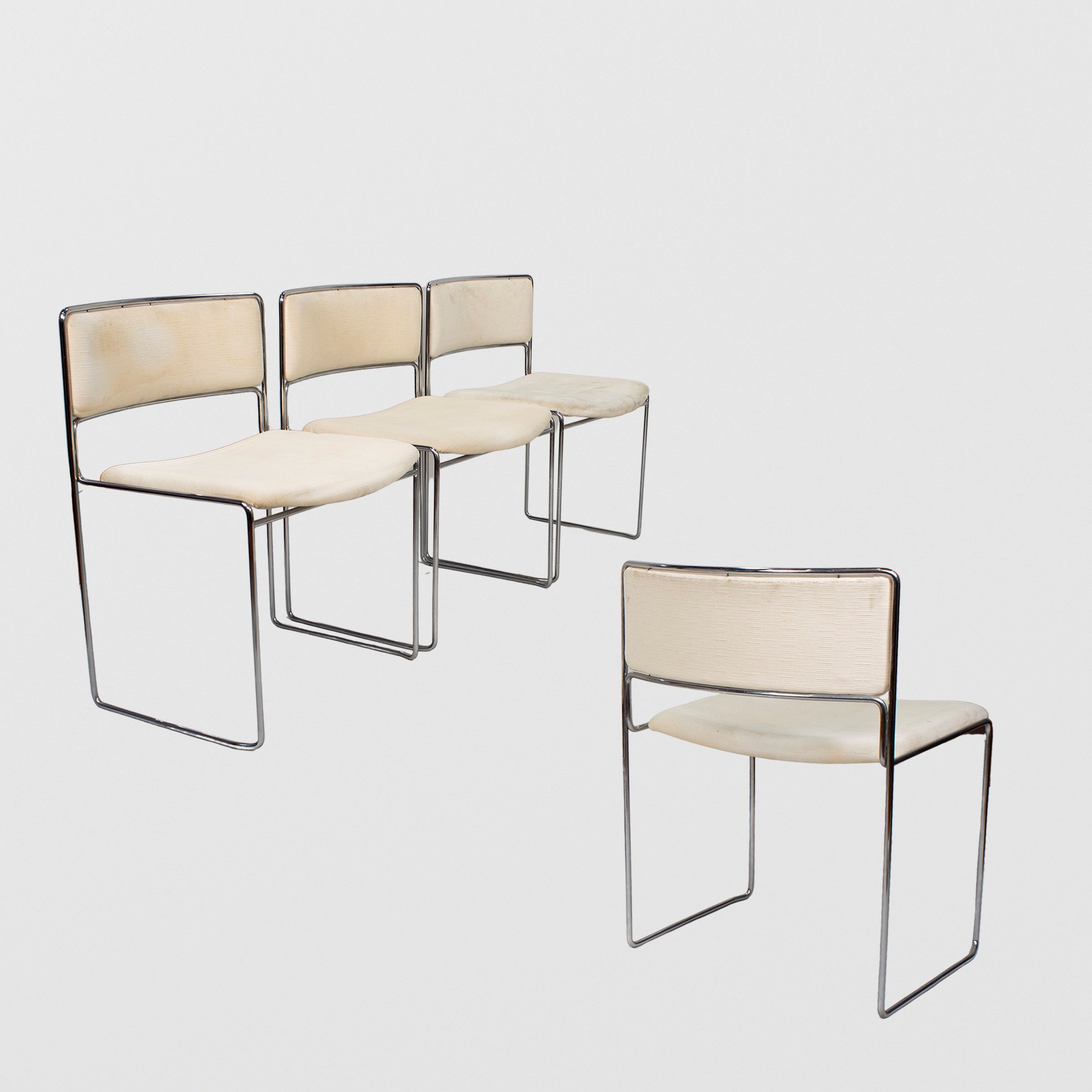 Danimarca, 1965 quattro sedie impilabili mod. FK90 in metallo cromato e tessuto imbottito, lievi usure