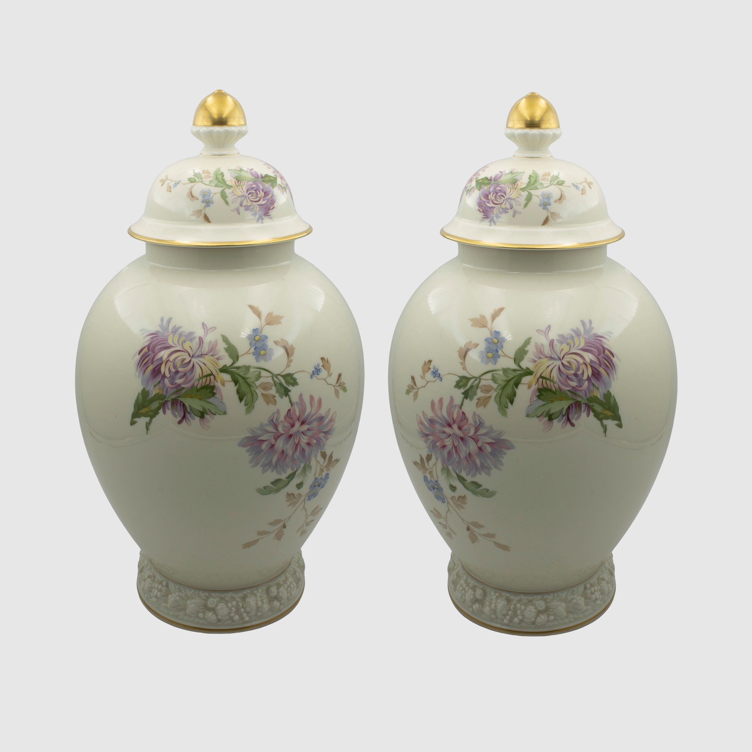 Germania, XX Sec. coppia di potiche mod. Chrysantheme, in porcellana policroma smaltata, marchio della produzione