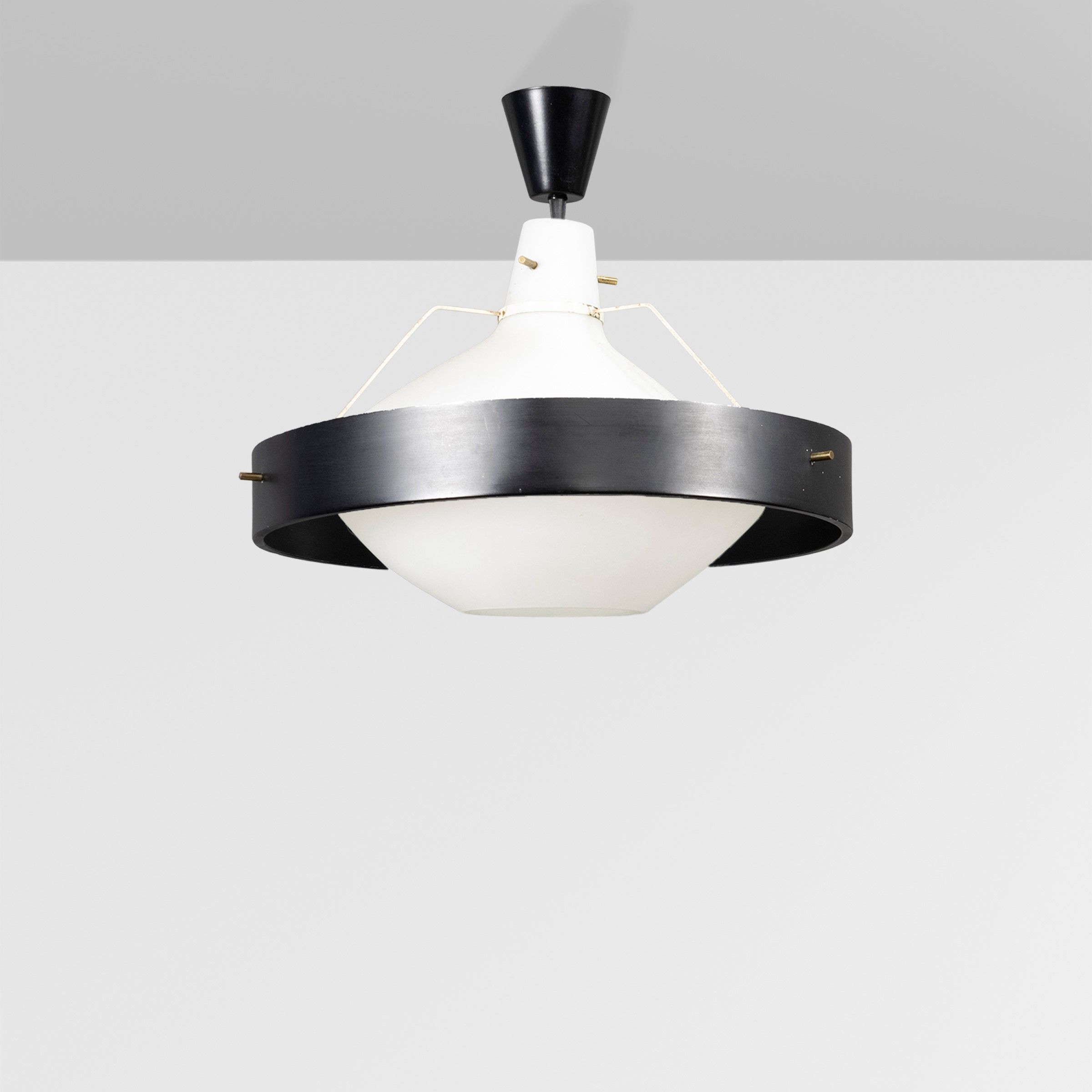 Italia, anni 50 lampada a sospensione in vetro opalino e metallo verniciato, usure