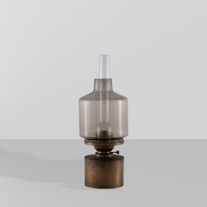 h. 41 cm. Svezia, anni 60 lampada da tavolo ad olio mod. L47 in ottone, vetro trasparente e vetro fumè, etichetta [..]