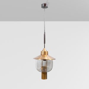 h. 130 cm. Francia, anni 50 lampada a sospensione in rame, ottone, metallo verniciato e vetro trasparente, etichetta [..]