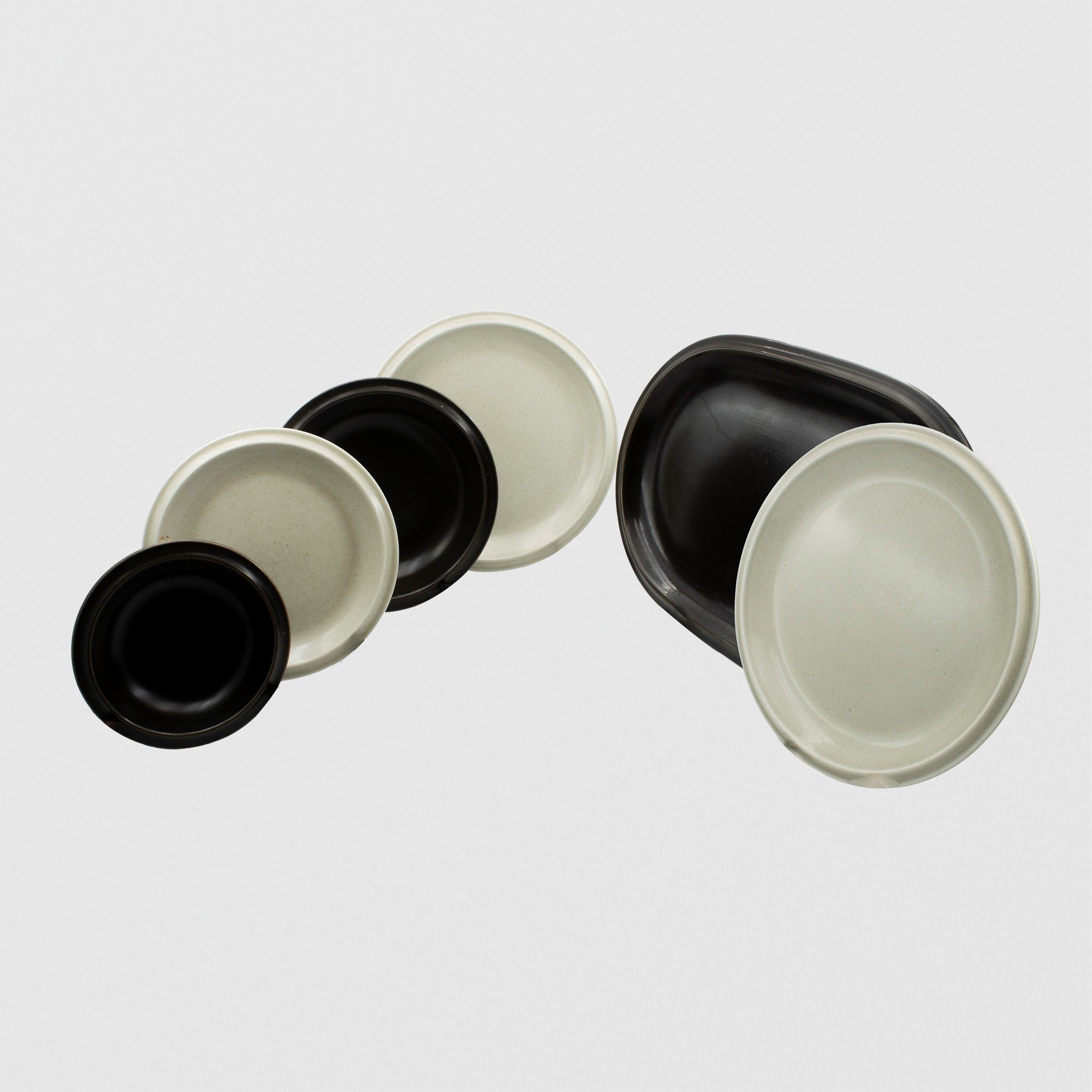 Italia, anni 60-70 servizio di piatti in terraglia, marchio della produzione, lievi difetti. Composto da: 6 piatti piani d. 25,5 cm. 6 piatti fondi d. 21 cm. 12 piatti frutta d. 20,5 cm. 12 coppette d. 15 cm. 2 piatti ovali da portata 38x25 cm. 1 piatto circolare da portata d. 30 cm.
