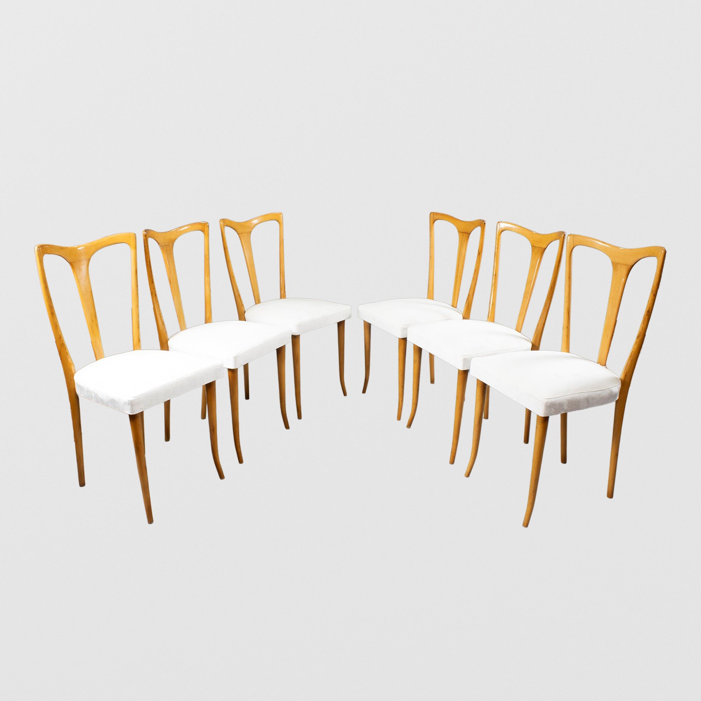 Italia, anni 60 sei sedie in legno e tessuto imbottito
