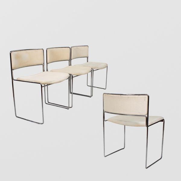 Danimarca, 1965 quattro sedie impilabili mod. FK90 in metallo cromato e tessuto imbottito, lievi usure
