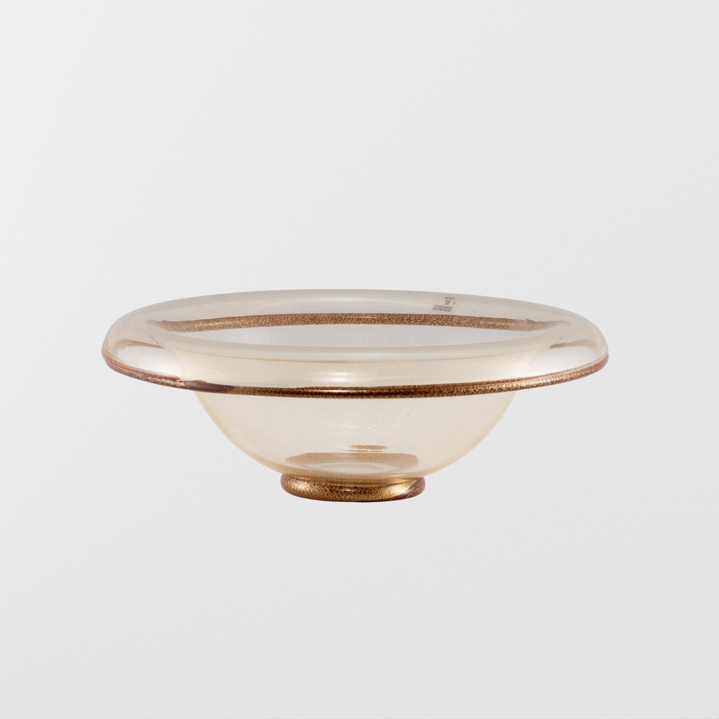 Murano, anni 80 centrotavola in vetro soffiato e foglia d'oro, firma a punta, etichetta della produzione