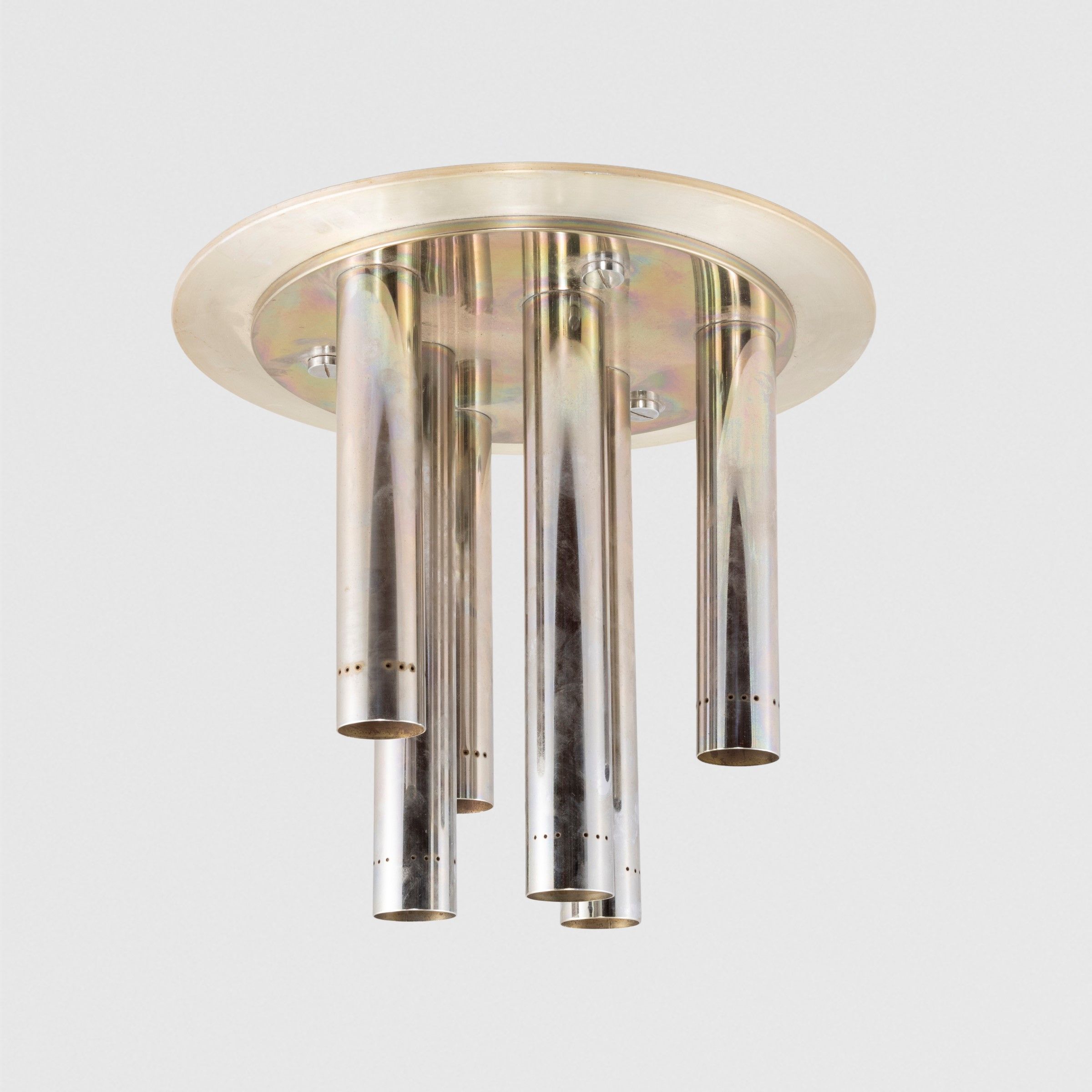 Italia, anni 60 lampada da soffitto in metallo cromato, etichetta della produzione, lievi usure