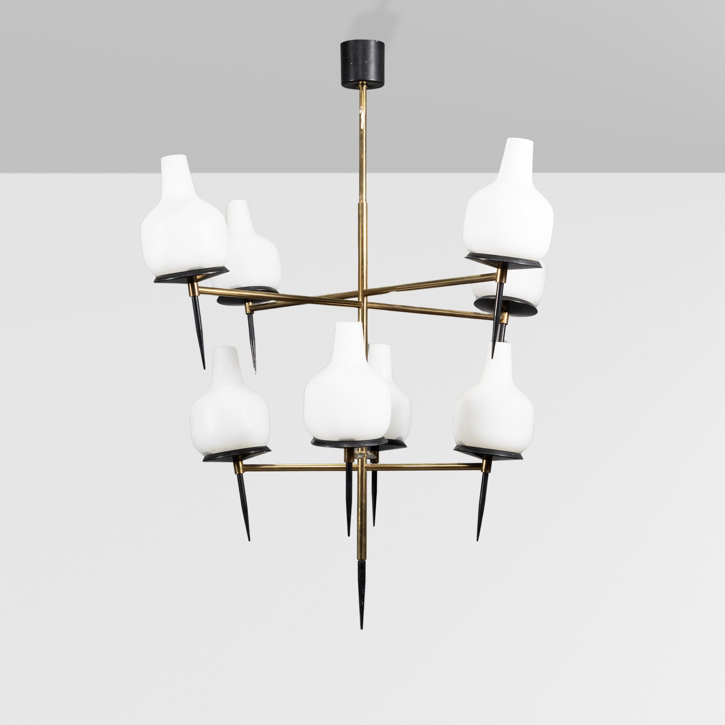 Italia, anni 50 lampada a sospensione in ottone, metallo verniciato e vetro opalino, lievi usure