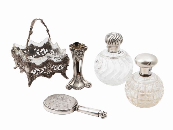 gr lordi 310, cestino h cm 16x17x15 (5) fine del XIX/inizio del XX secolo tra cui uno specchio da borsetta a mano con portarossetto e portacipria, due flaconi in vetro molato ed un cestino interamente traforato con fiori e volute ed interno in cristallo molato, lievi difetti