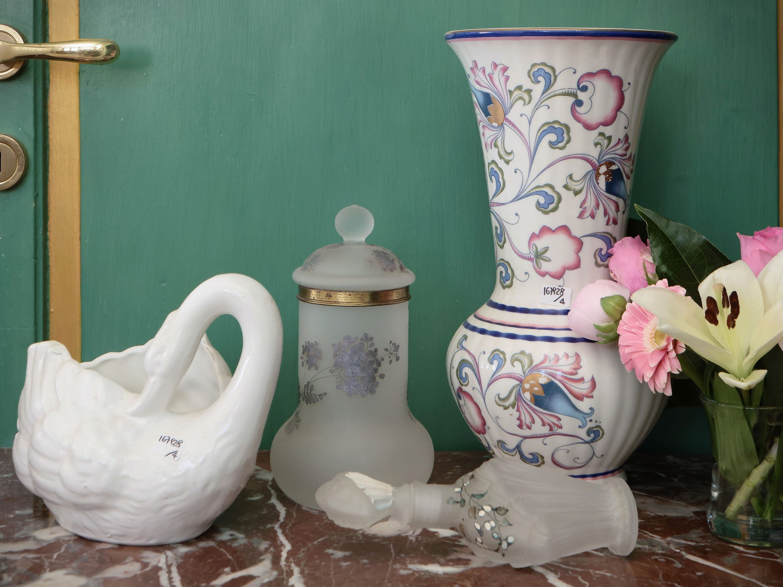 tra cui una fioriera in ceramica a foggia di cigno, un vaso a tromba in ceramica dipinta con volute e fiori ed un flacone in vetro dipinto con motivo vegetale
