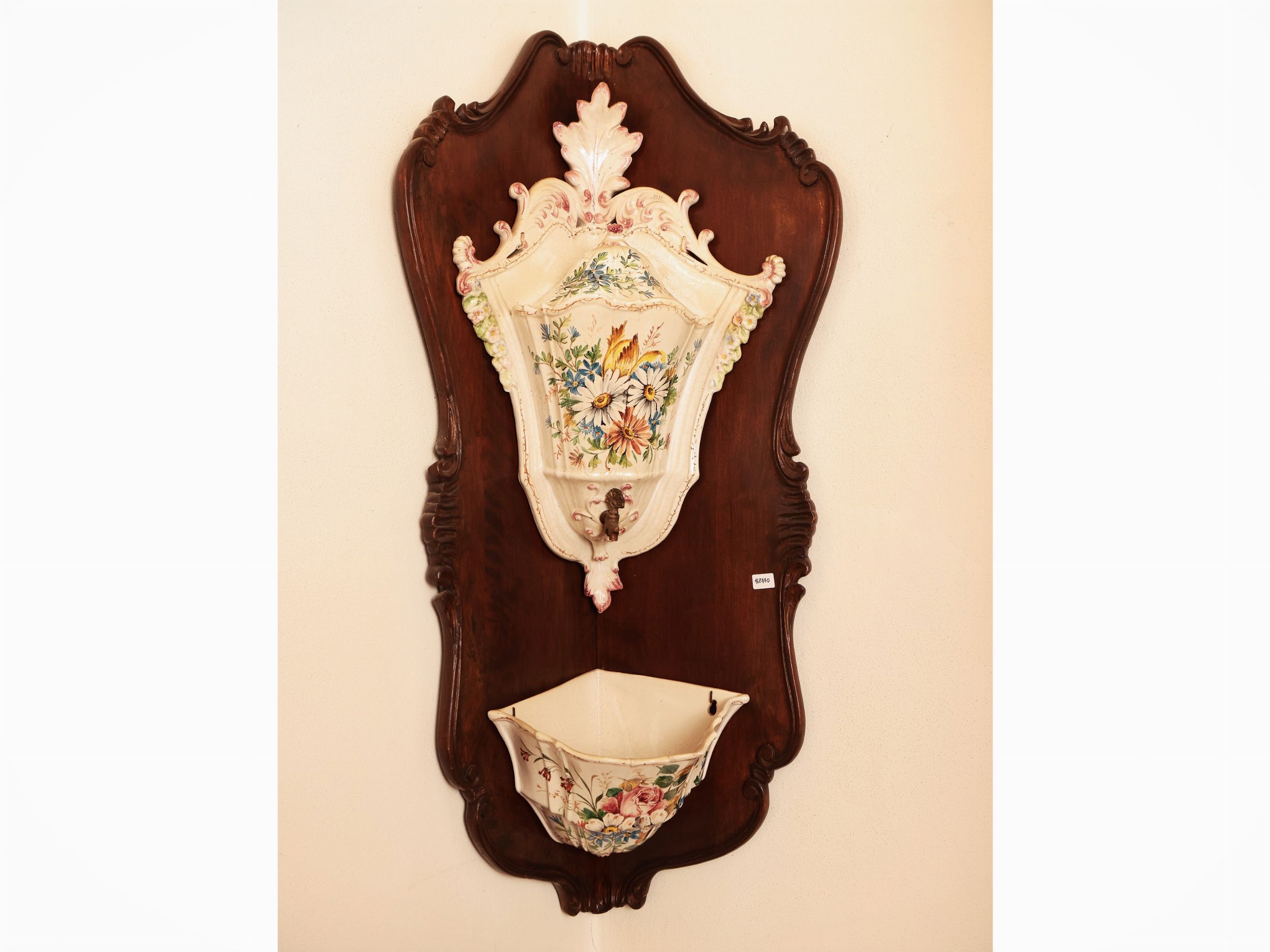 fine del XIX secolo dipinta in policromia con motivi floreali, applicato a scudo in noce intagliato con volute