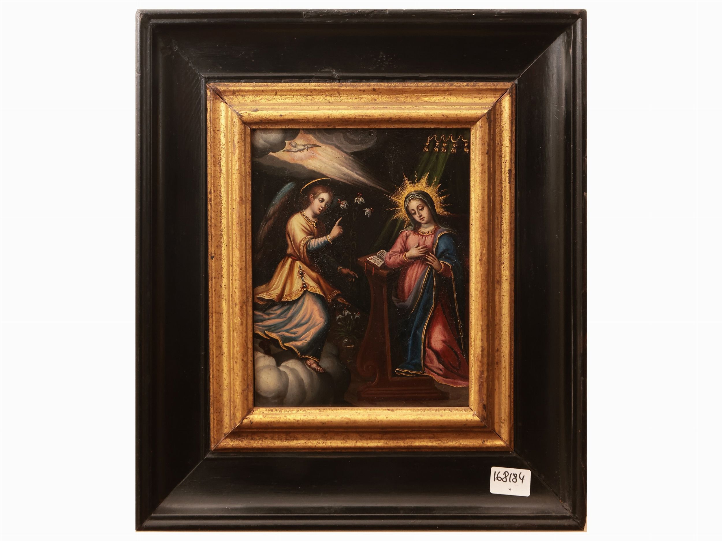 nello stile della pittura fiamminga del XVI secolo olio su rame, in cornice ebanizzata