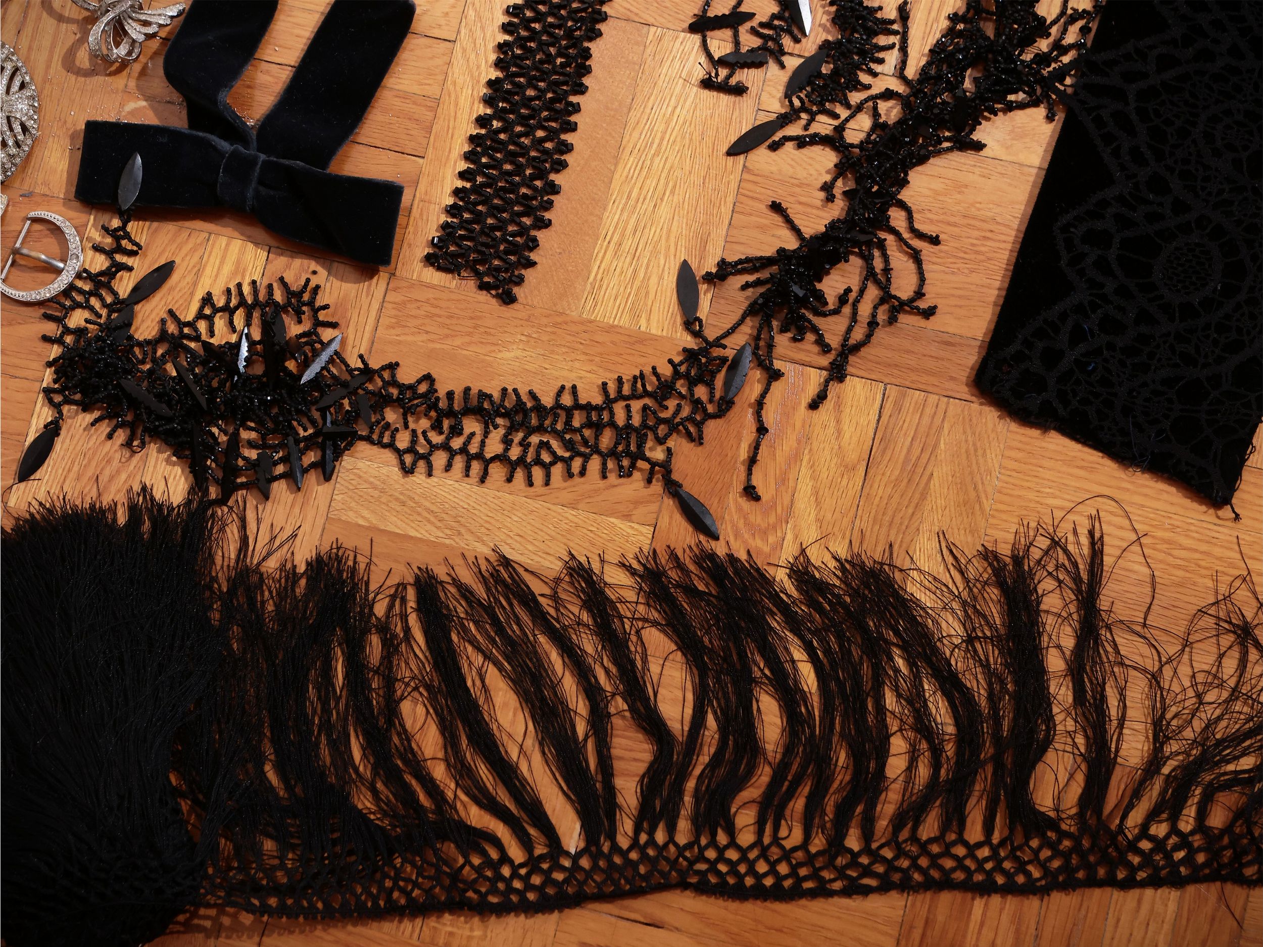 prima metà del XX secolo tra cui alcune bordure realizzate in jais e paillette, velette e pizzi, difetti