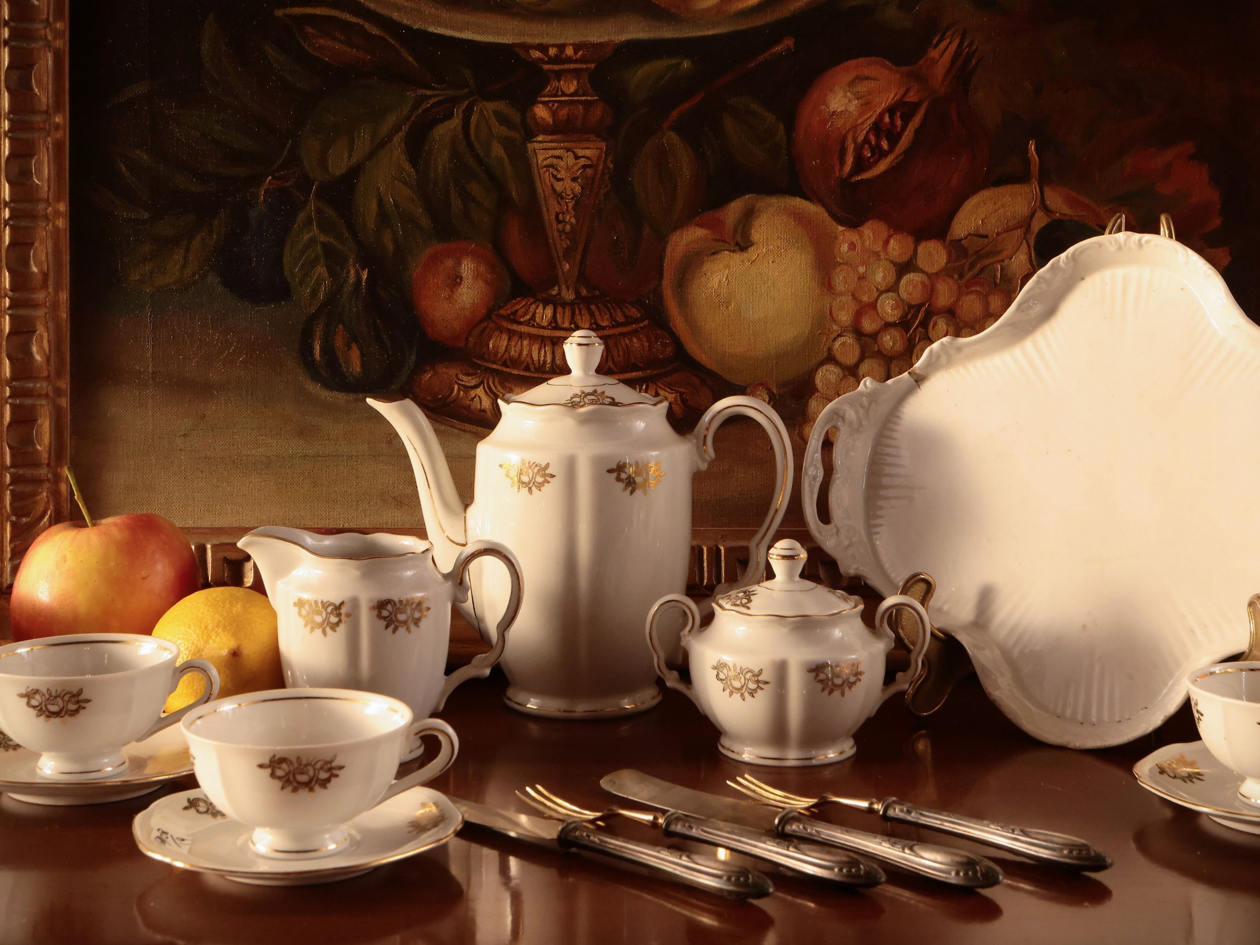 vassoio cm 23x28 (19) fine del XIX/inizio del XX secolo composto da una serie di 6 forchettine e coltellini da dessert con manico rivestito in argento, un servizio da caffè in porcellana lumeggiato in oro composto da caffettiera, lattiera, zuccheriera e serie di 6 tazzine corredate da piattino ed un vassoietto in porcellana di forma sagomata