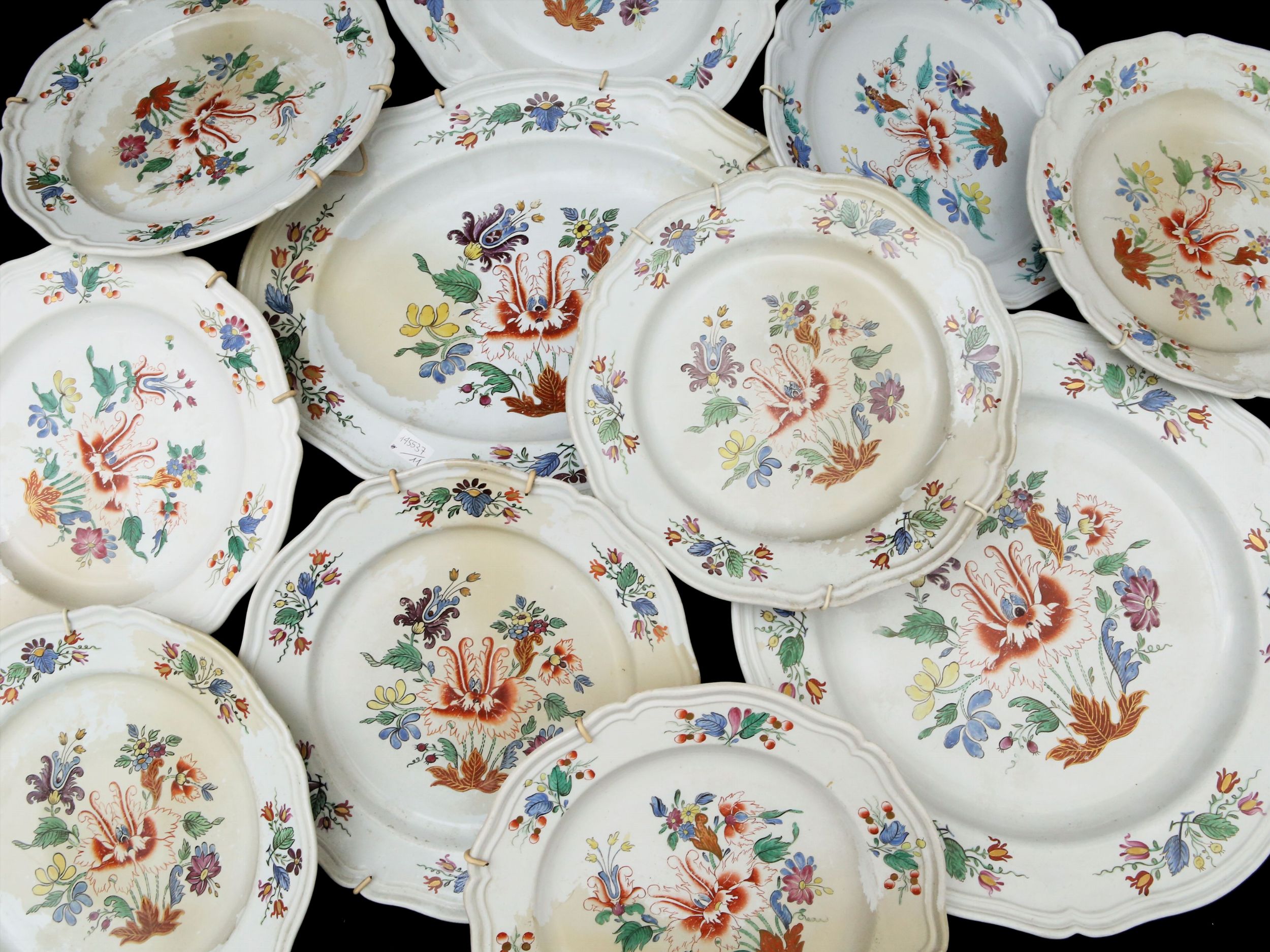 Ginori, XIX secolo dipinte con il decoro del tulipano, composto da un vassoio ovale, uno rotondo, sette piatti piani ed uno fondo, alcuni difetti e restauri