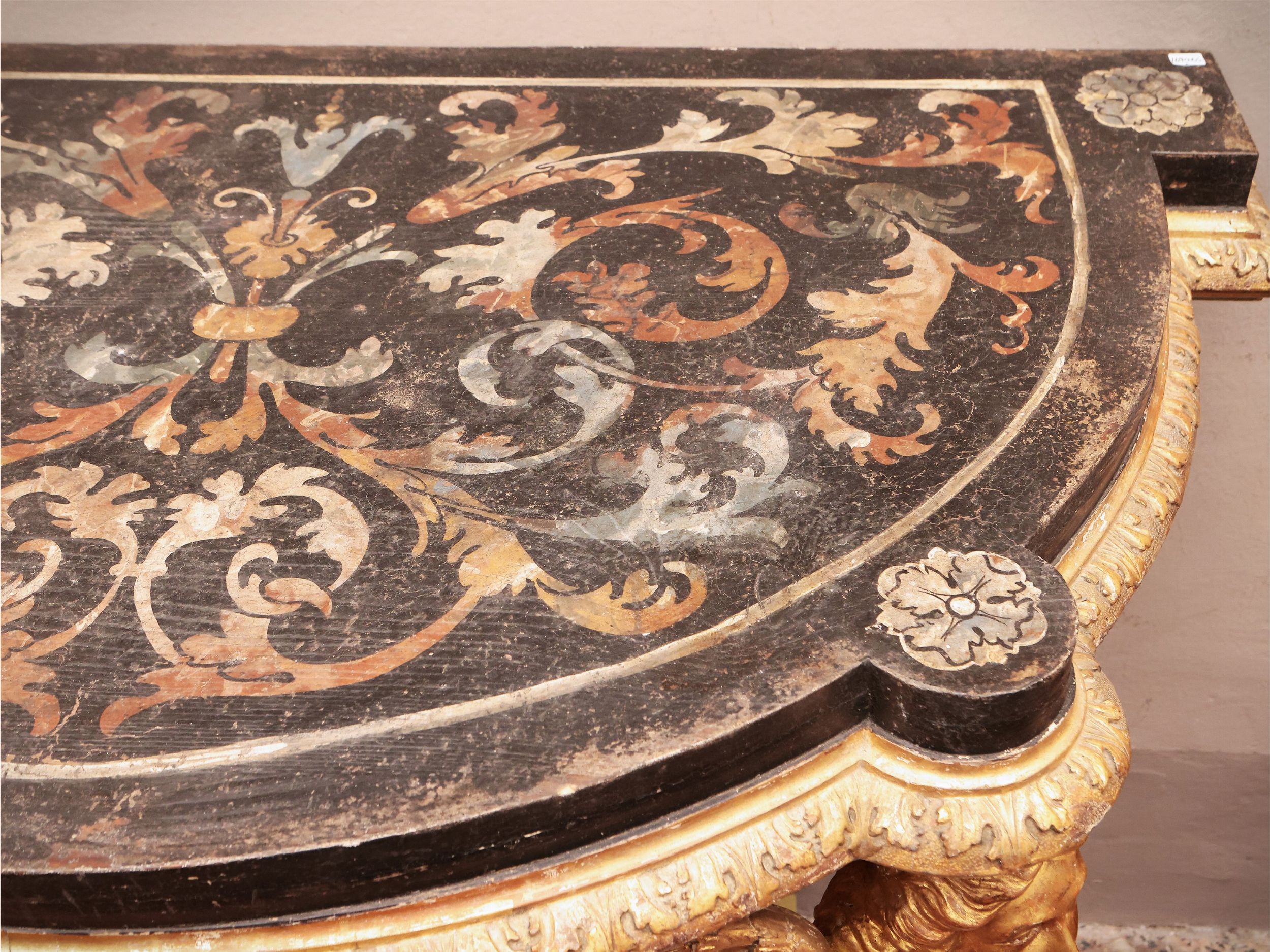 h cm 111x122x67 seconda metà del XX secolo laccato verde acqua e lumeggiato in oro, piano sagomato in legno ebanizzato dipinto ad imitazione della scagliola, sostegni anteriori modellati come due figure antropomorfe, alate con finali a voluta, colonna centrale, base sagomata