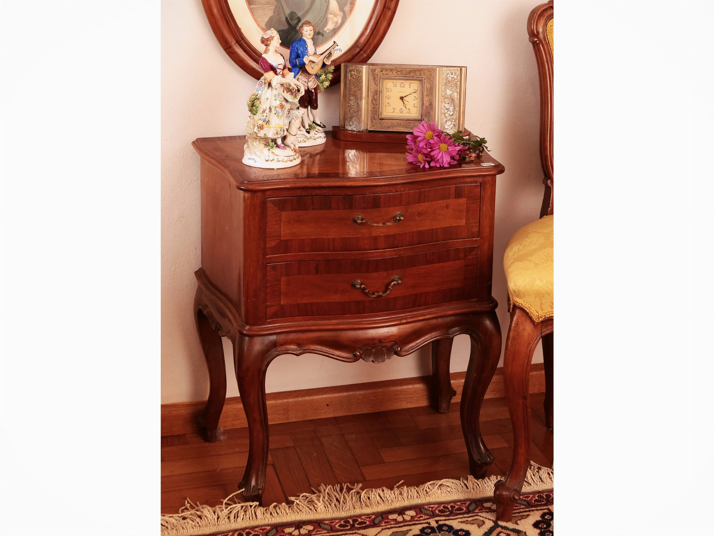 Coppia di comodini impiallacciato in noce ed altre essenze