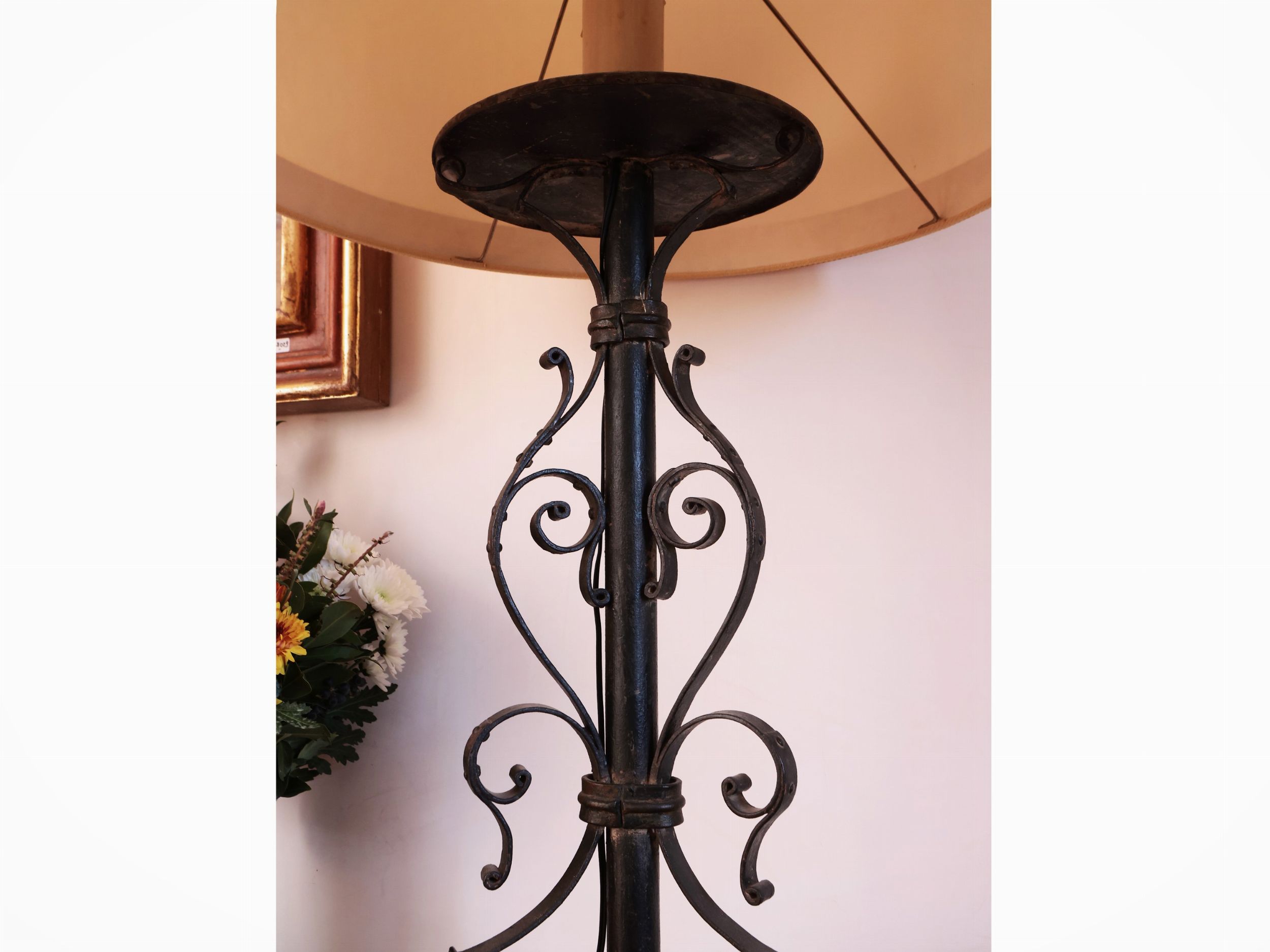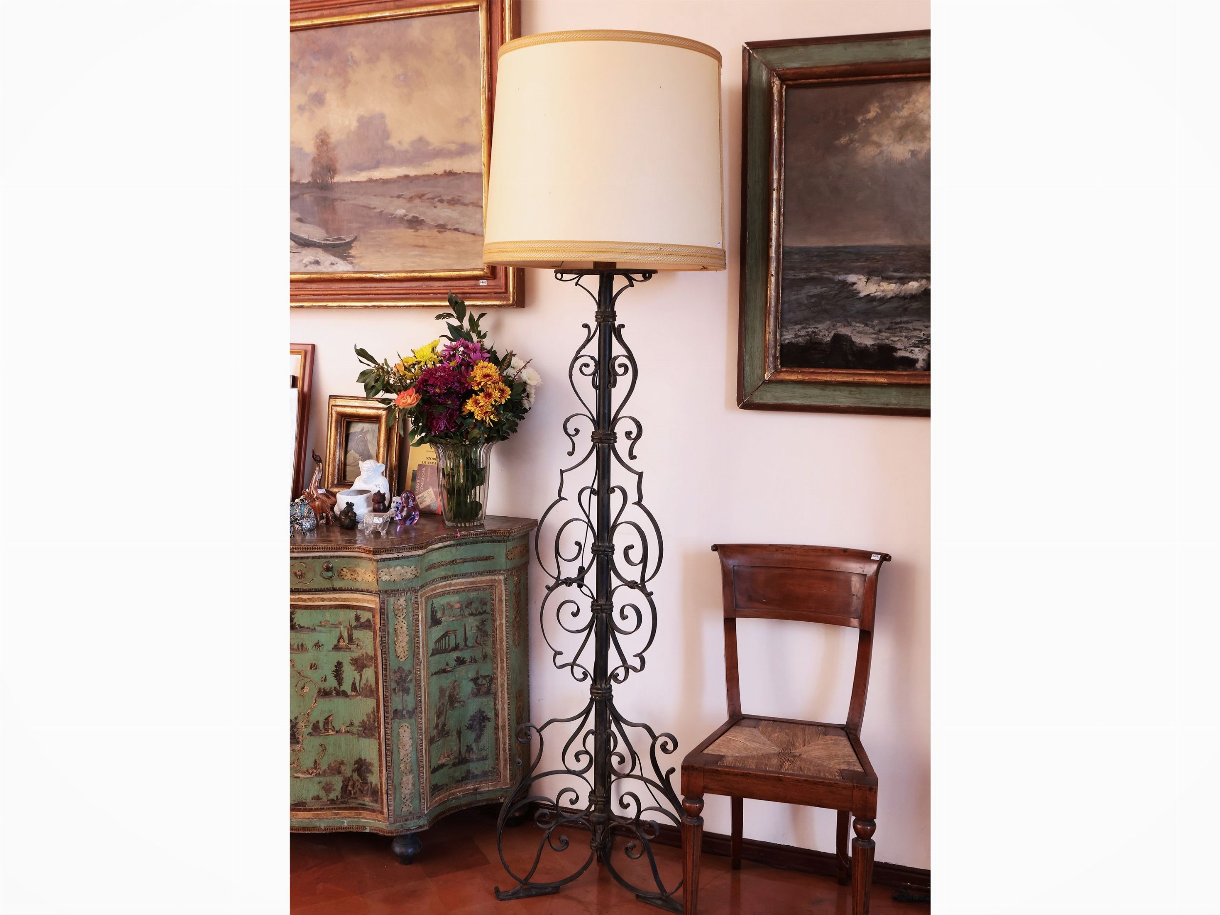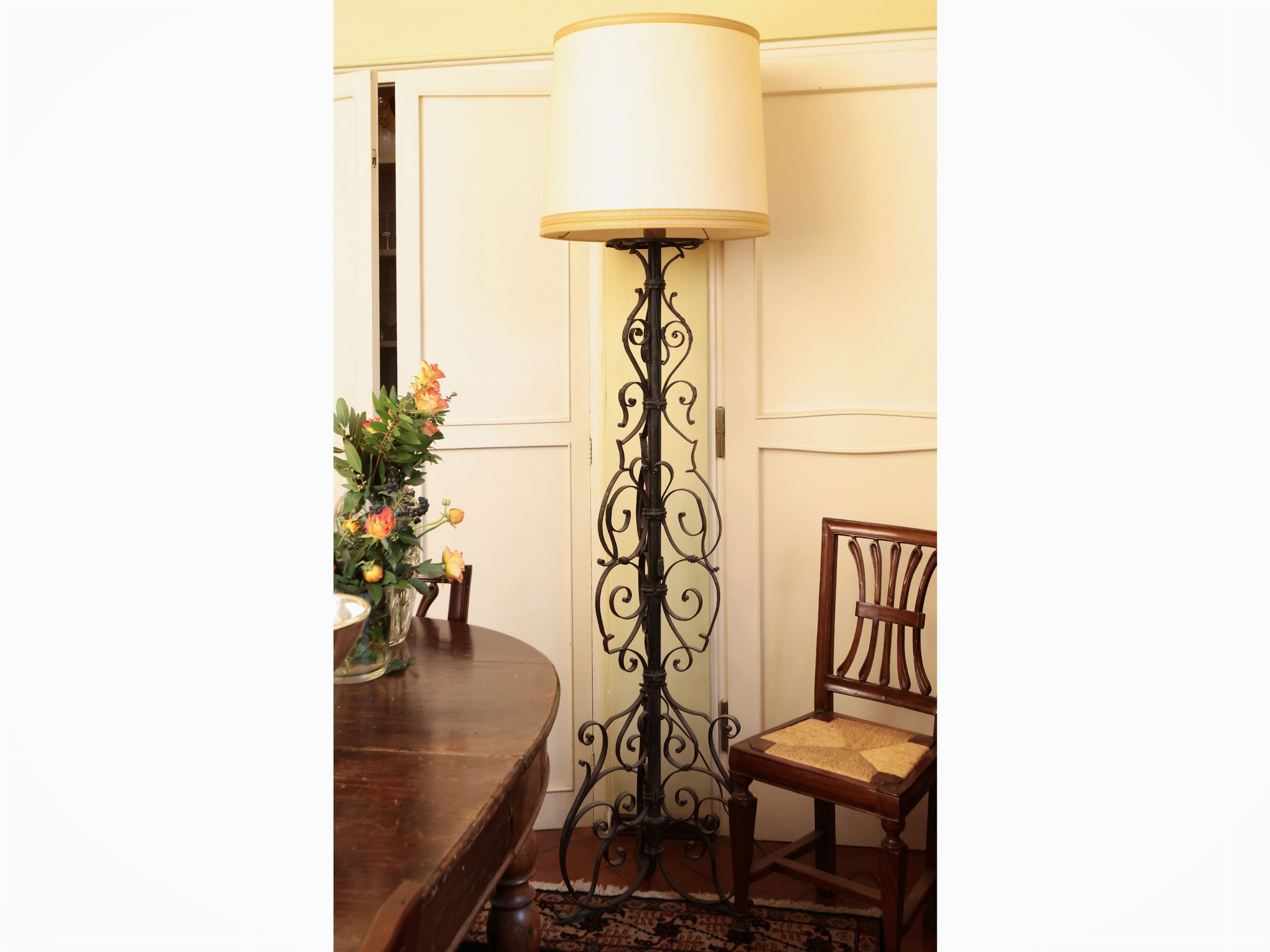 stelo interamente realizzato a volute, corredate da paralume in tessuto avorio con dettagli in passamaneria